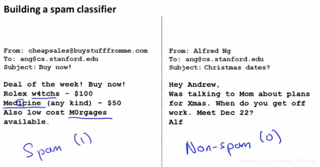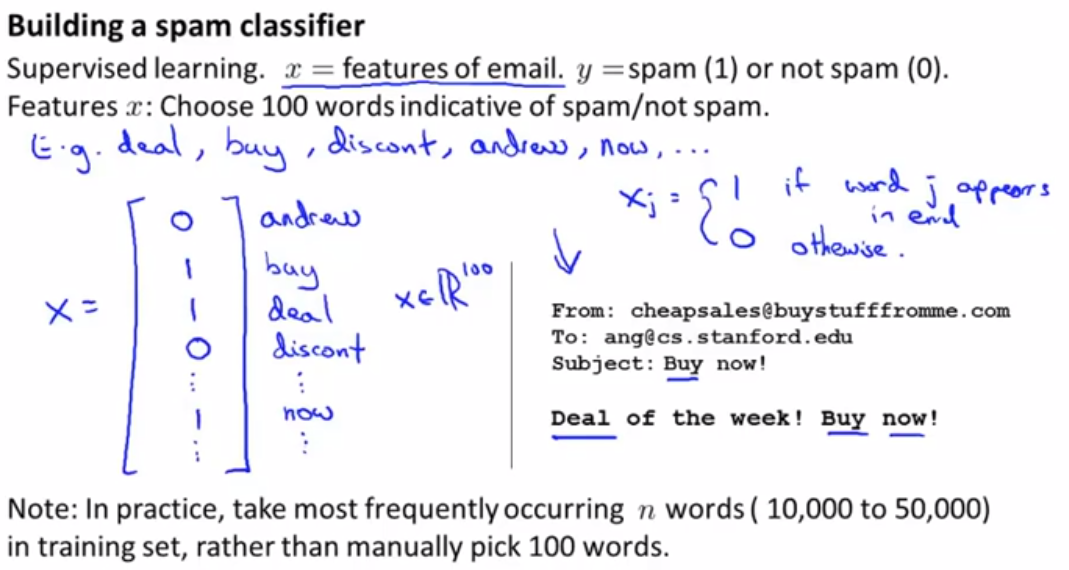 为了应用监督学习,首先要想的是如何来表示邮件的特征向量x: