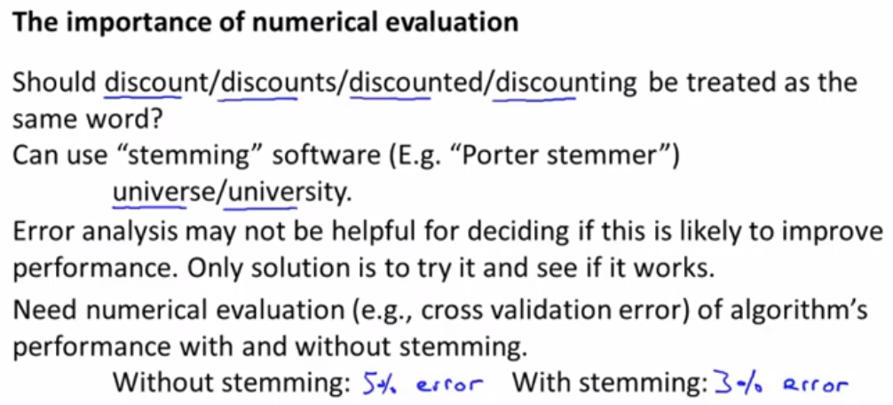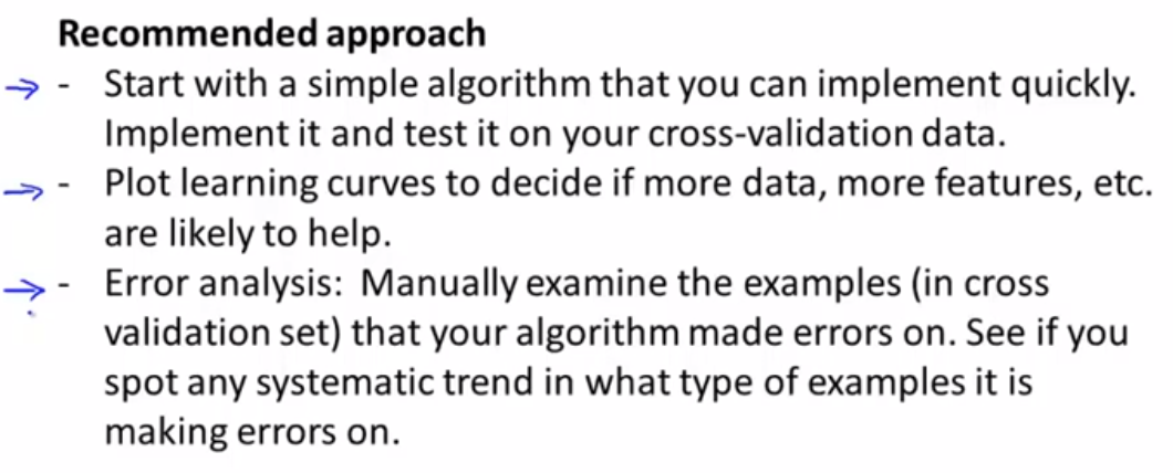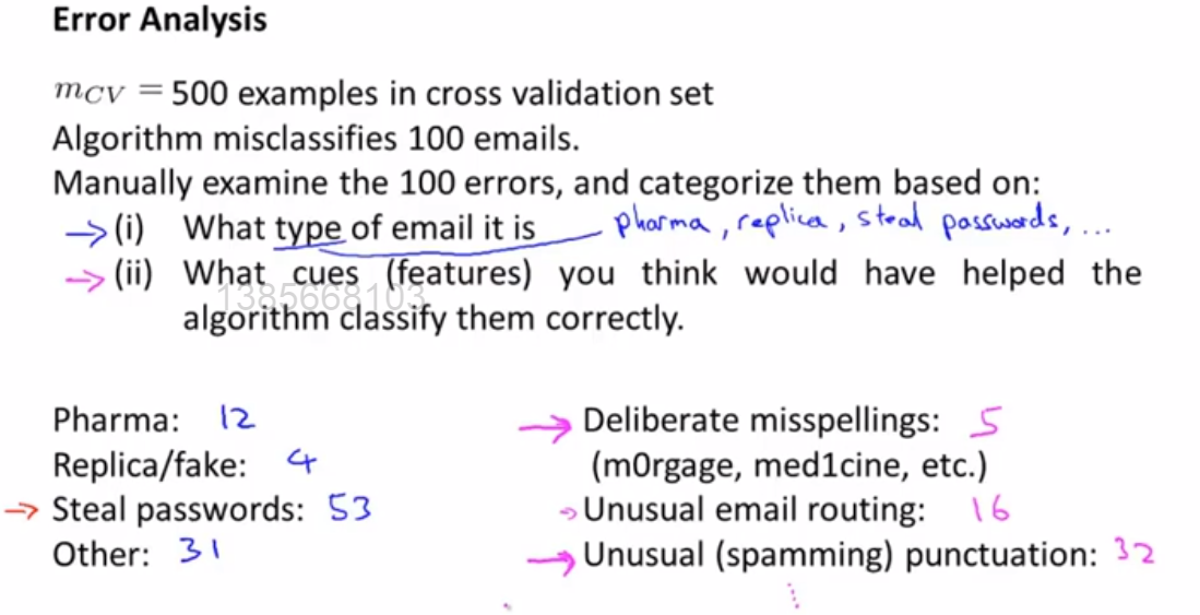 3、误差分析:看交叉验证的数据,看被算法错误分类的文件,有什么共同的特征和规律,思考应该设计怎样的新特征,或目前的系统有什么优点和缺点;