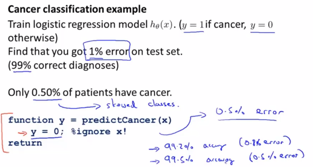 #skewed classes(偏斜率):一个类中的样本数与另一个类的数据相比多很多。