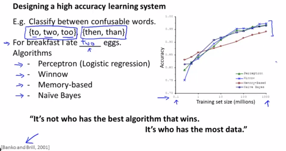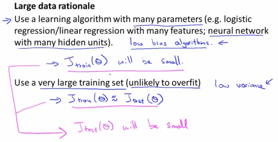 2、我们能否得到一组庞大的训练集,并且在这个训练集中训练一个有很多参数的学习算法。